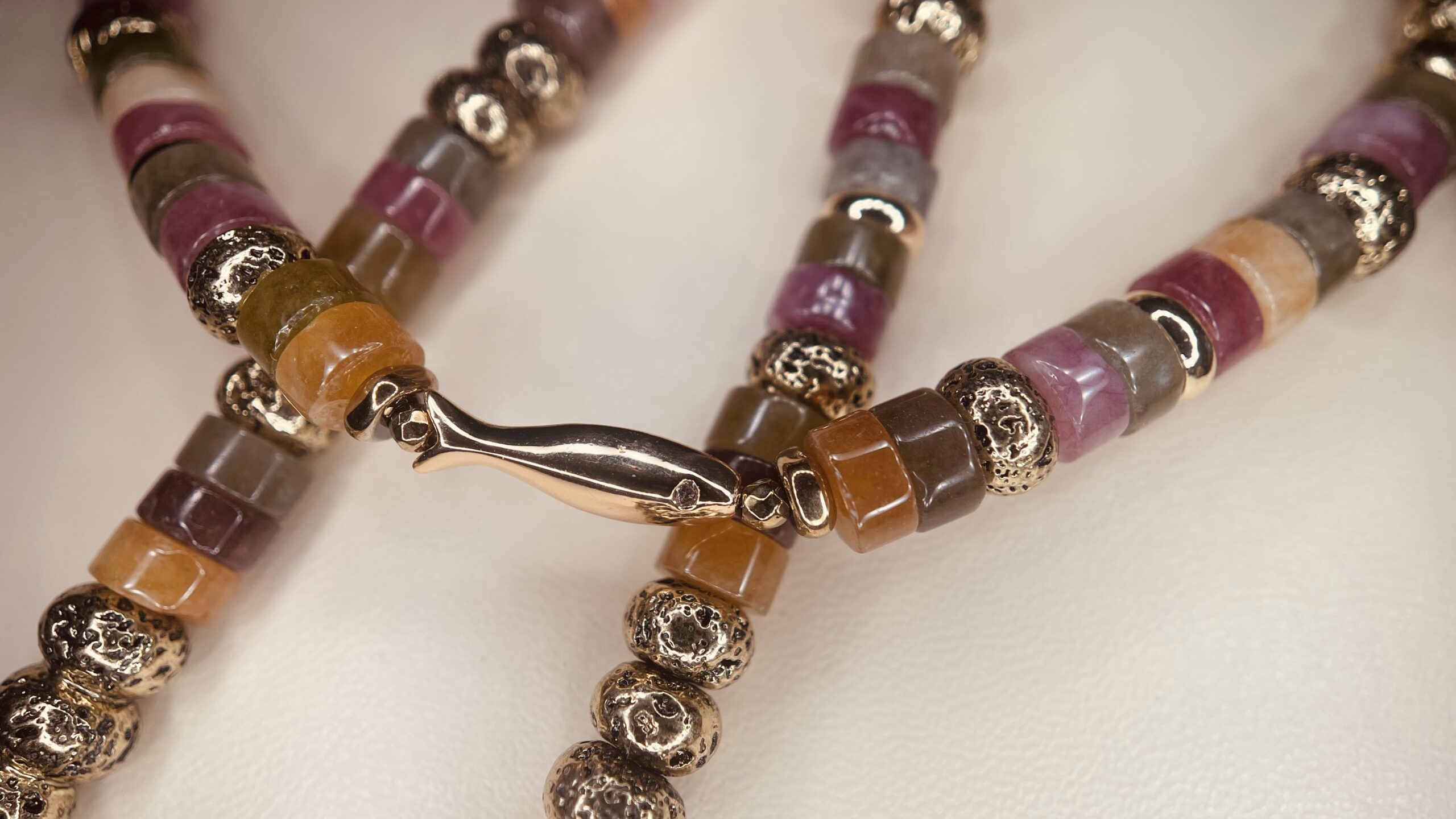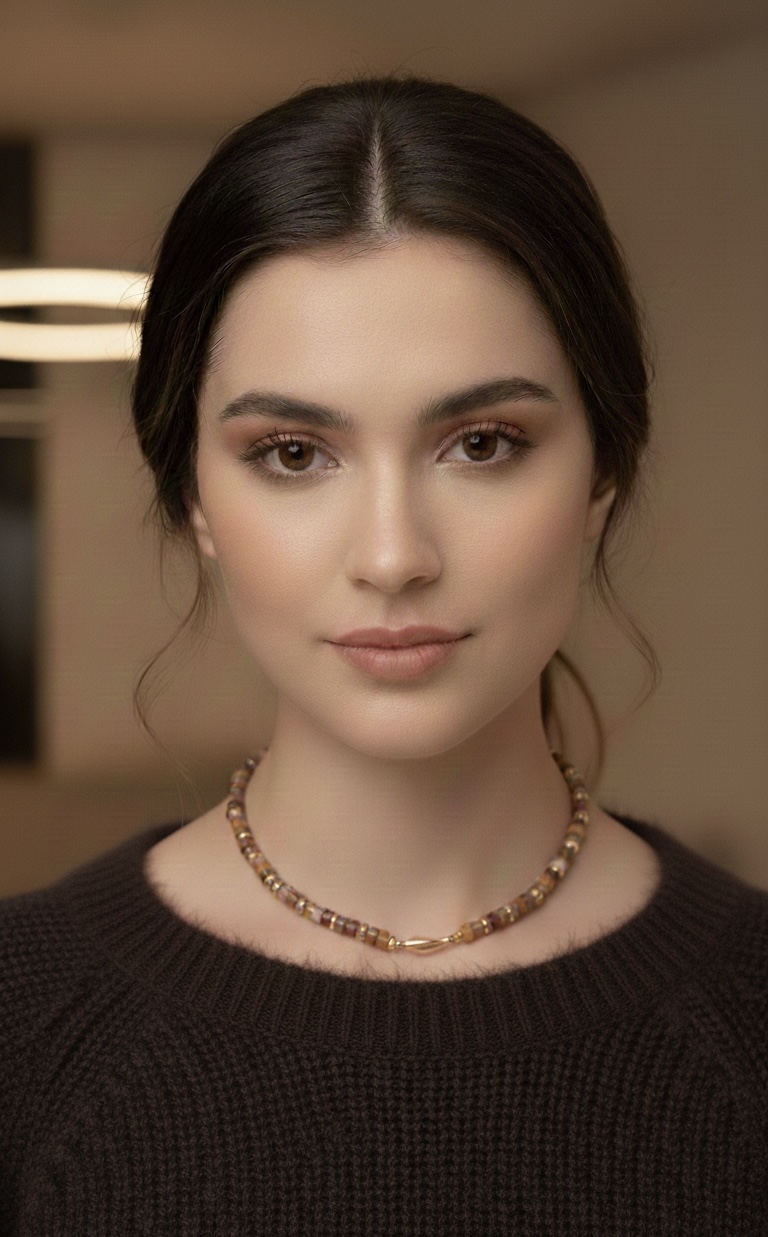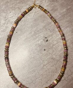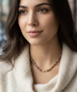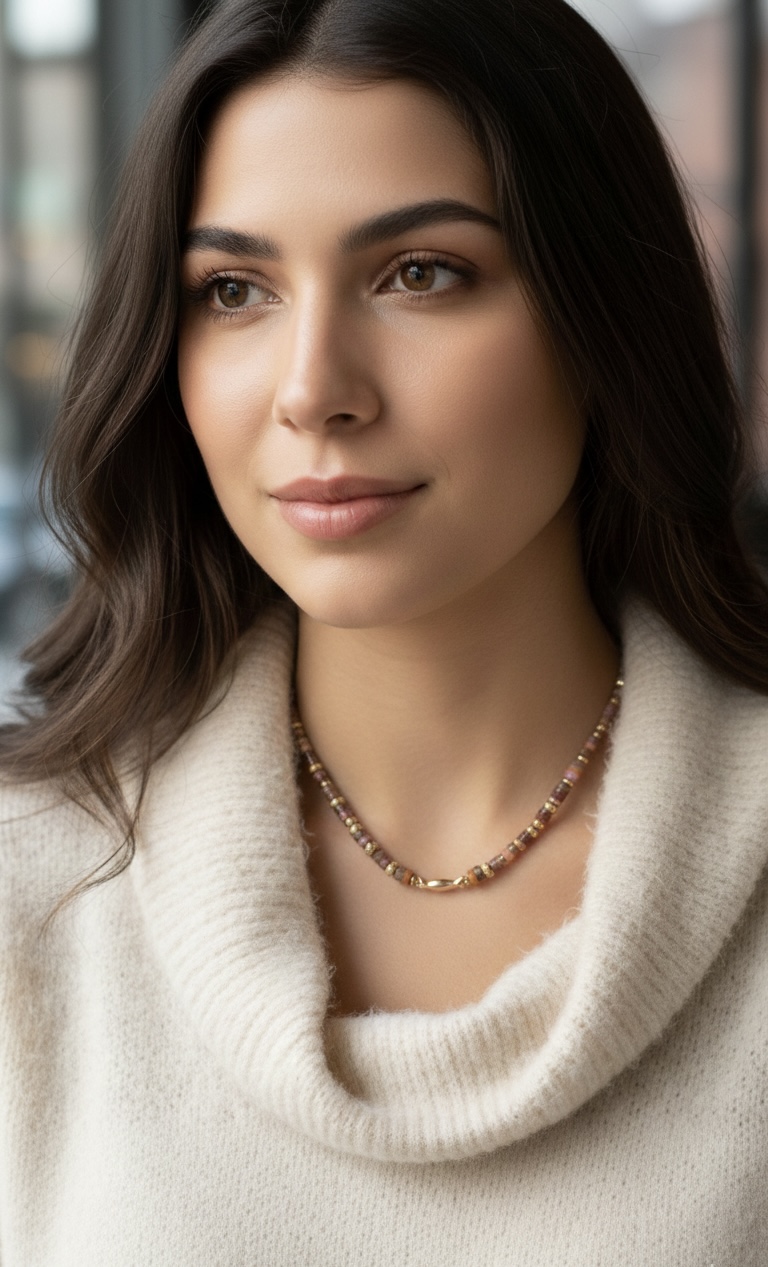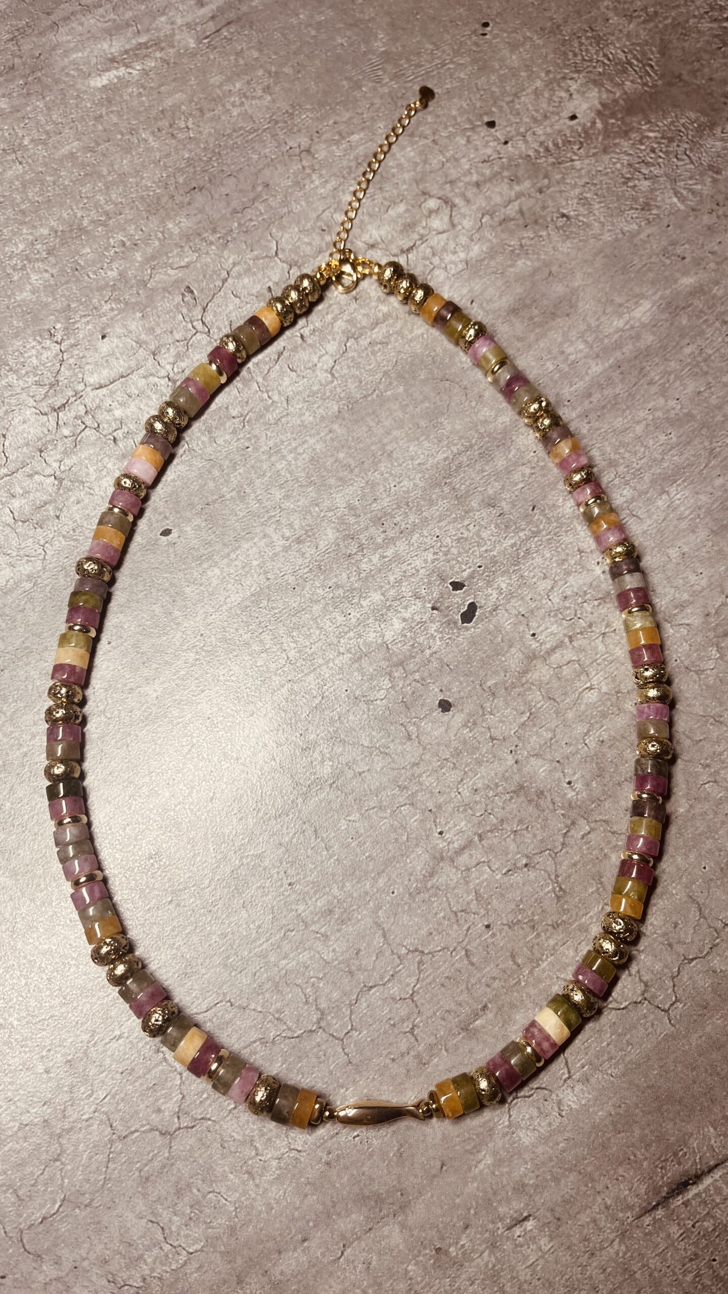 Collier délicat en pierres naturelles aux tons doux et chaleureux, ponctué de perles dorées qui apportent une touche lumineuse. Entièrement assemblé à la main, il se distingue par son élégance discrète et son harmonie de couleurs. Une pièce fine et raffinée, facile à porter au quotidien comme en accumulation.